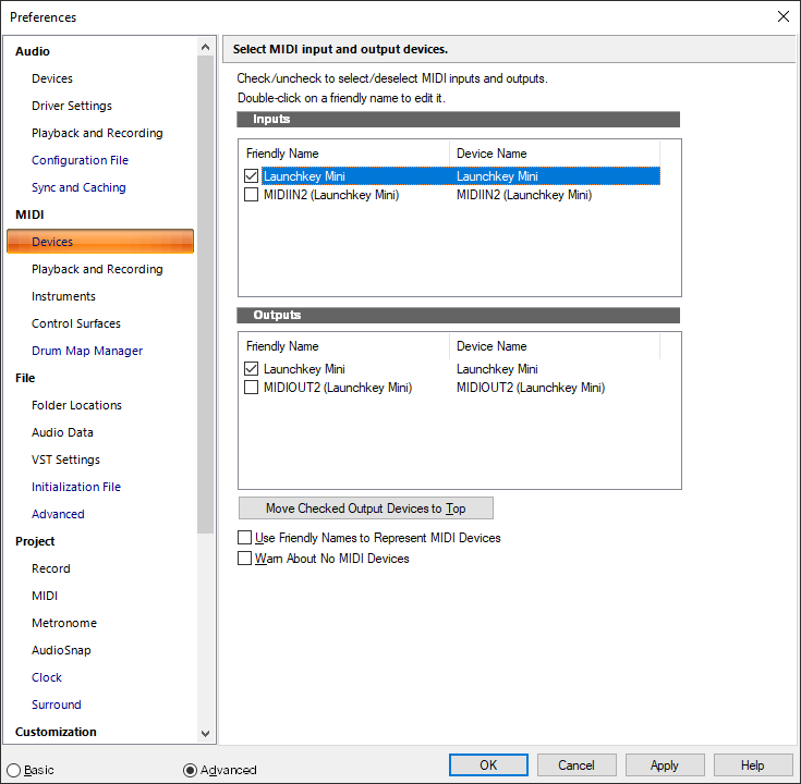 - En MIDI > Dispositivos, asegúrate de que tu teclado MIDI esté marcado bajo Entrada.