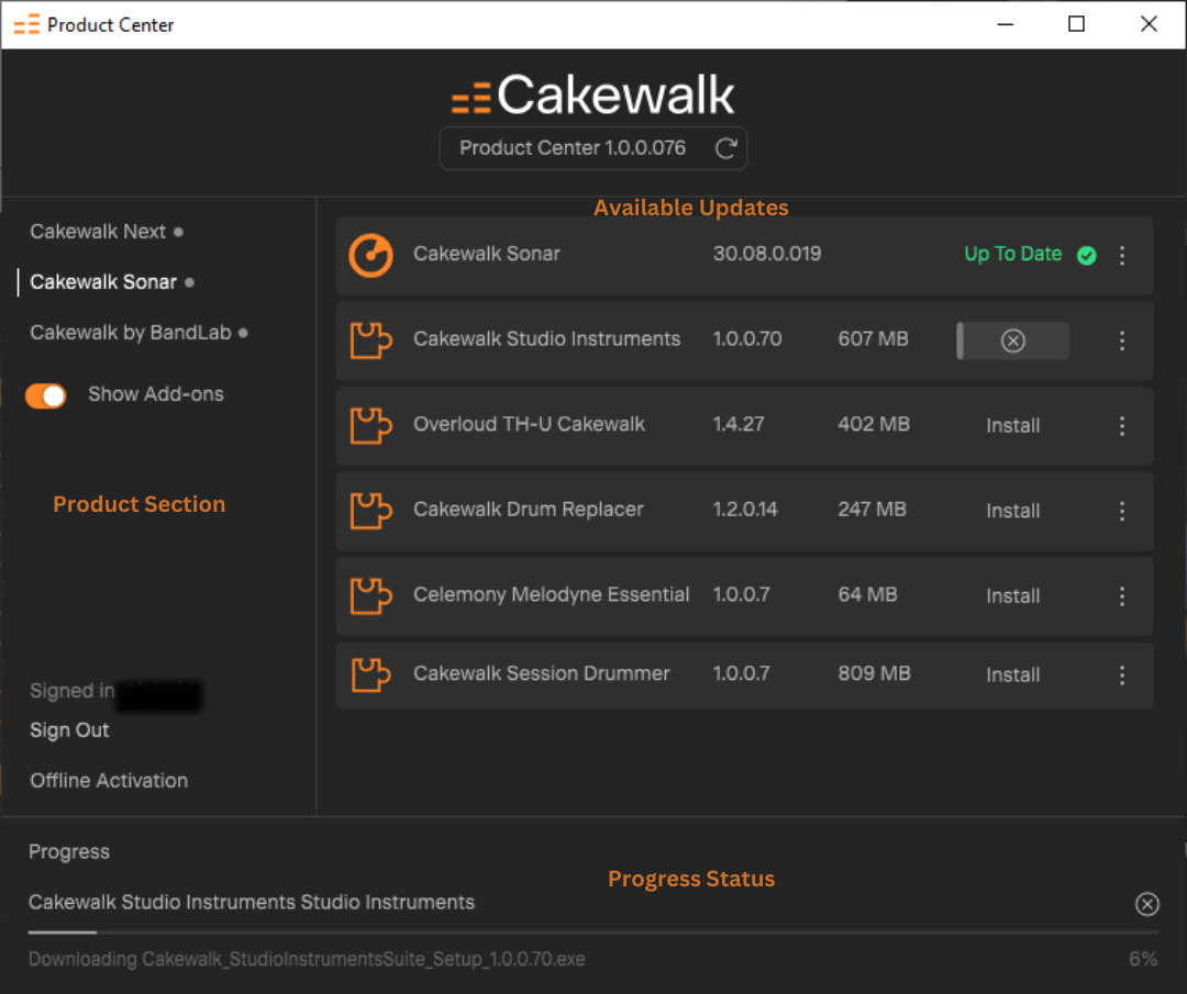 Cakewalk Product Center es un programa todo en uno que te permite descargar, instalar y actualizar los últimos productos de Cakewalk (Next, Sonar y Cakewalk by BandLab) desde una ubicación central y realizar la activación sin conexión. Inicia sesión con tu cuenta de BandLab para mantenerte actualizado con las últimas funciones y correcciones.